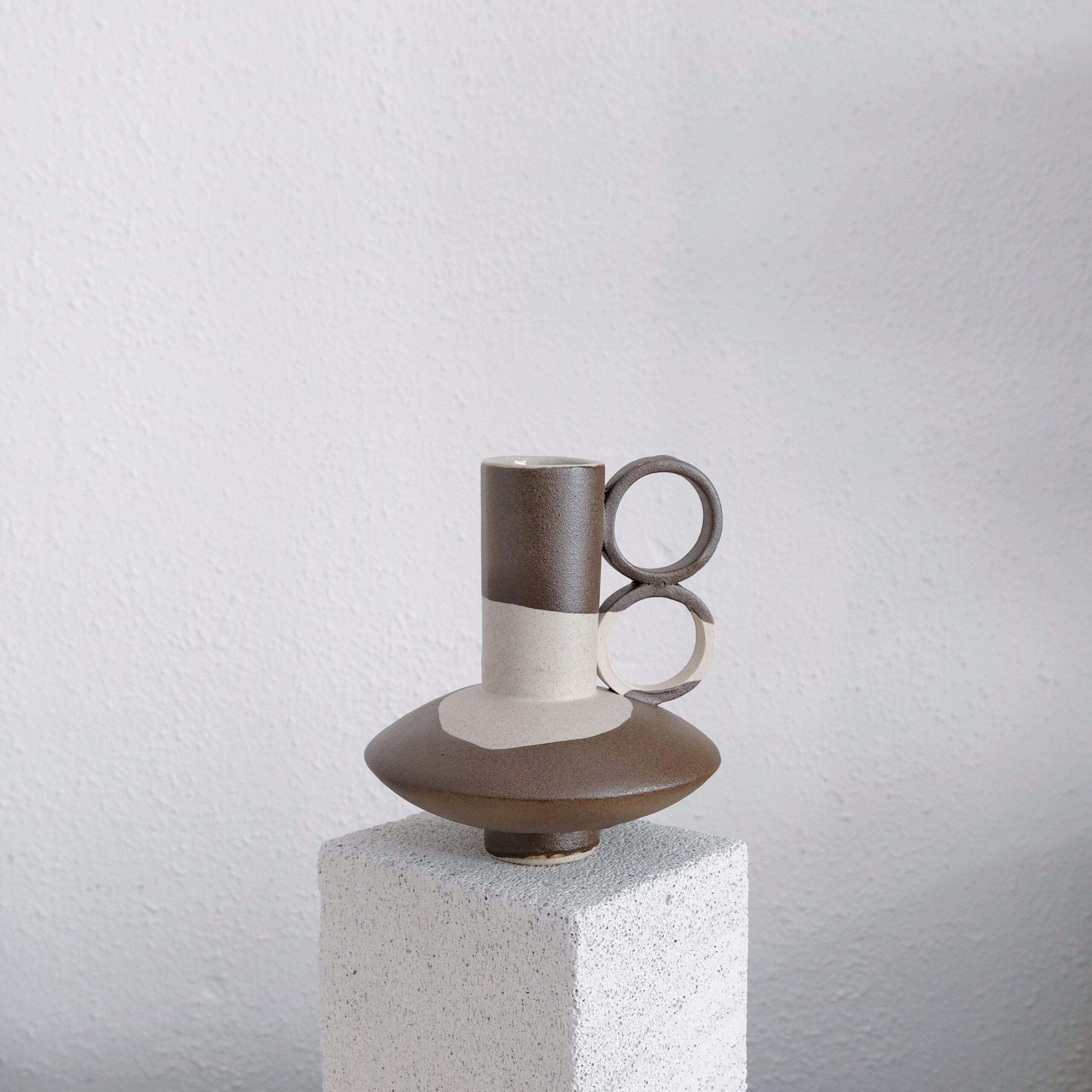 “A staging of how restrictions can enhance creativity. The artist creates vase-like sculptures that play with two separate shapes – a cylinder and a disc-orb – transforming them into various possibilities. By using porcelain as a medium, it is possible to cut the shapes into multiple pieces and place them in a way that creates something new every time. These sculptures are then hand-painted with sharp-edged lines to enhance the contrast of the natural white porcelain. The artist saw comparability to a zebra with its black and white lines and a dinosaur with their multiple handles added in different parts of the sculpture’s body. These animalistic resemblances came to unite the name for this series: Zebrino.”