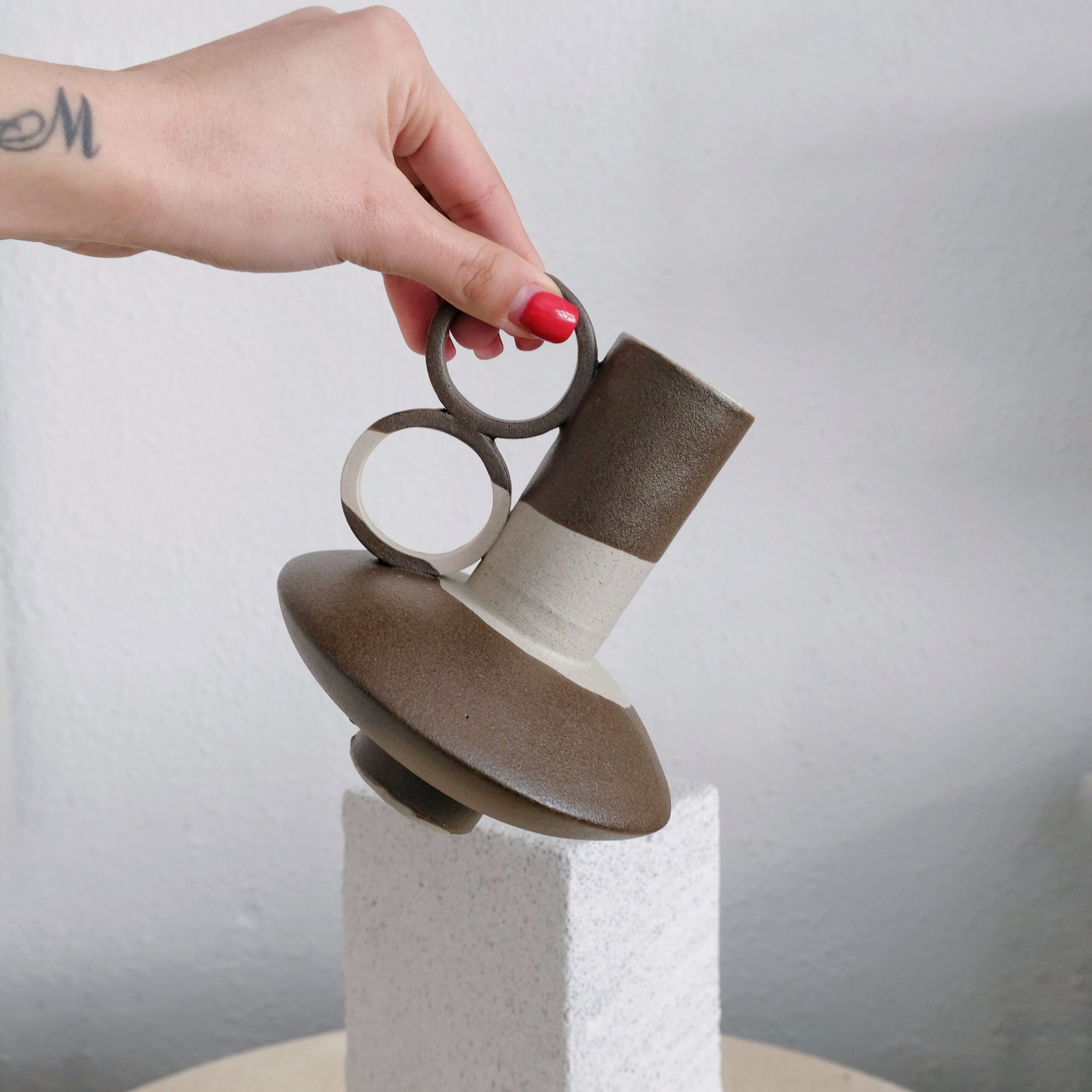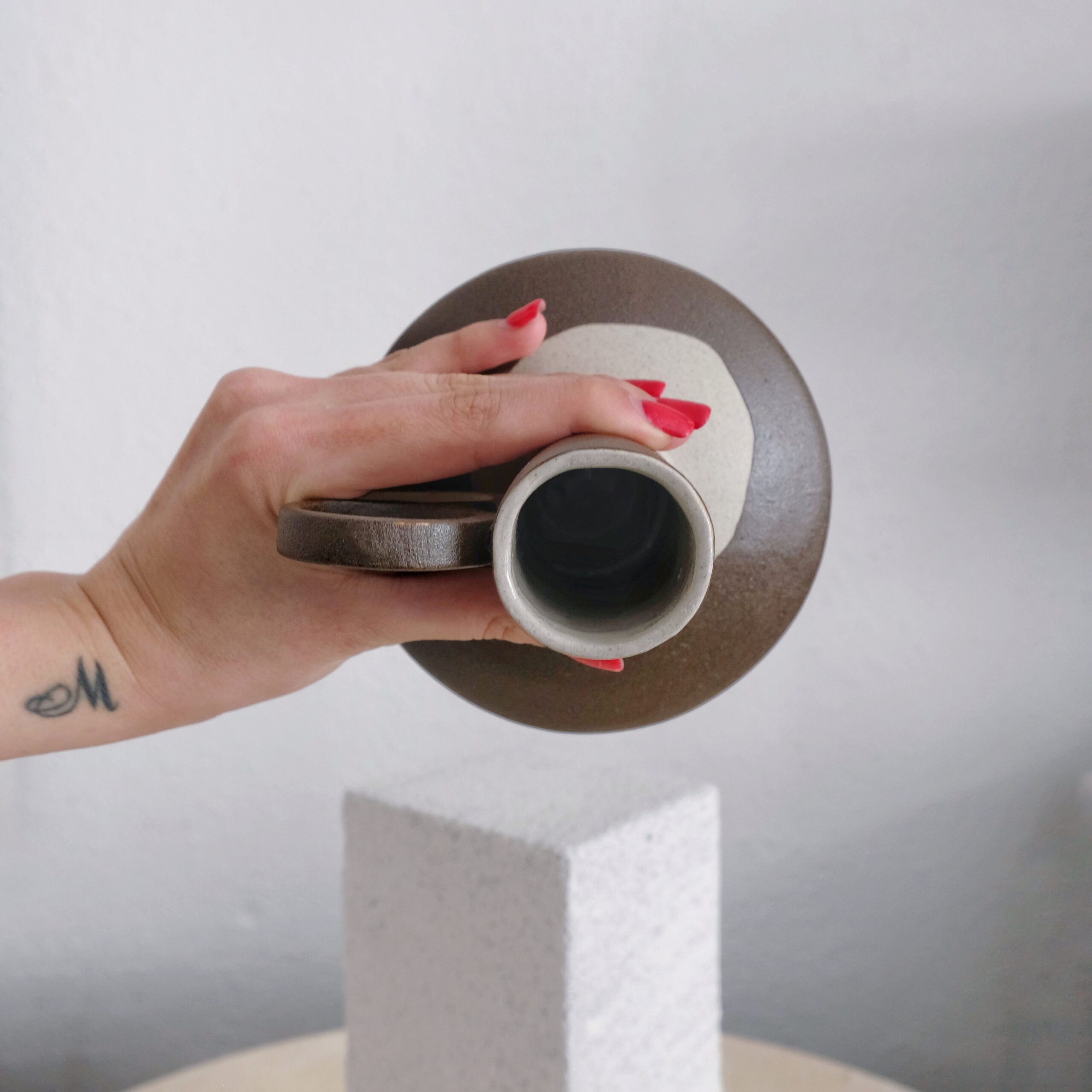 This piece is dipped in a slip made from wild clay I foraged along the banks of the Magdalena River, near Barranquilla, the city where I grew up in Colombia. The Magdalena is one of South America’s great rivers, and its sediment carries millennia of geological memory. When fired, this clay transforms into something unexpected: a surface that is simultaneously matte and metallic, catching light in a way that feels more mineral than ceramic.