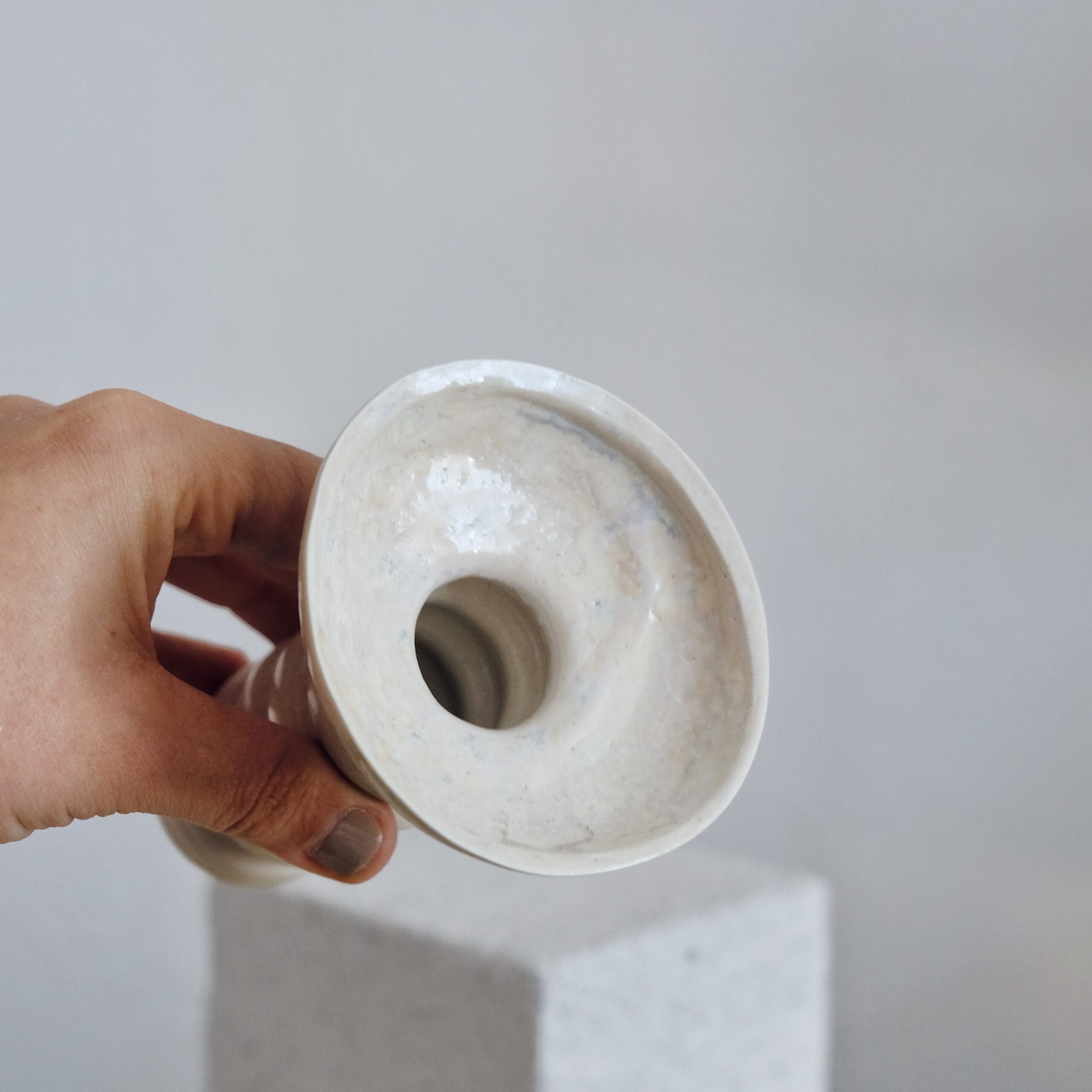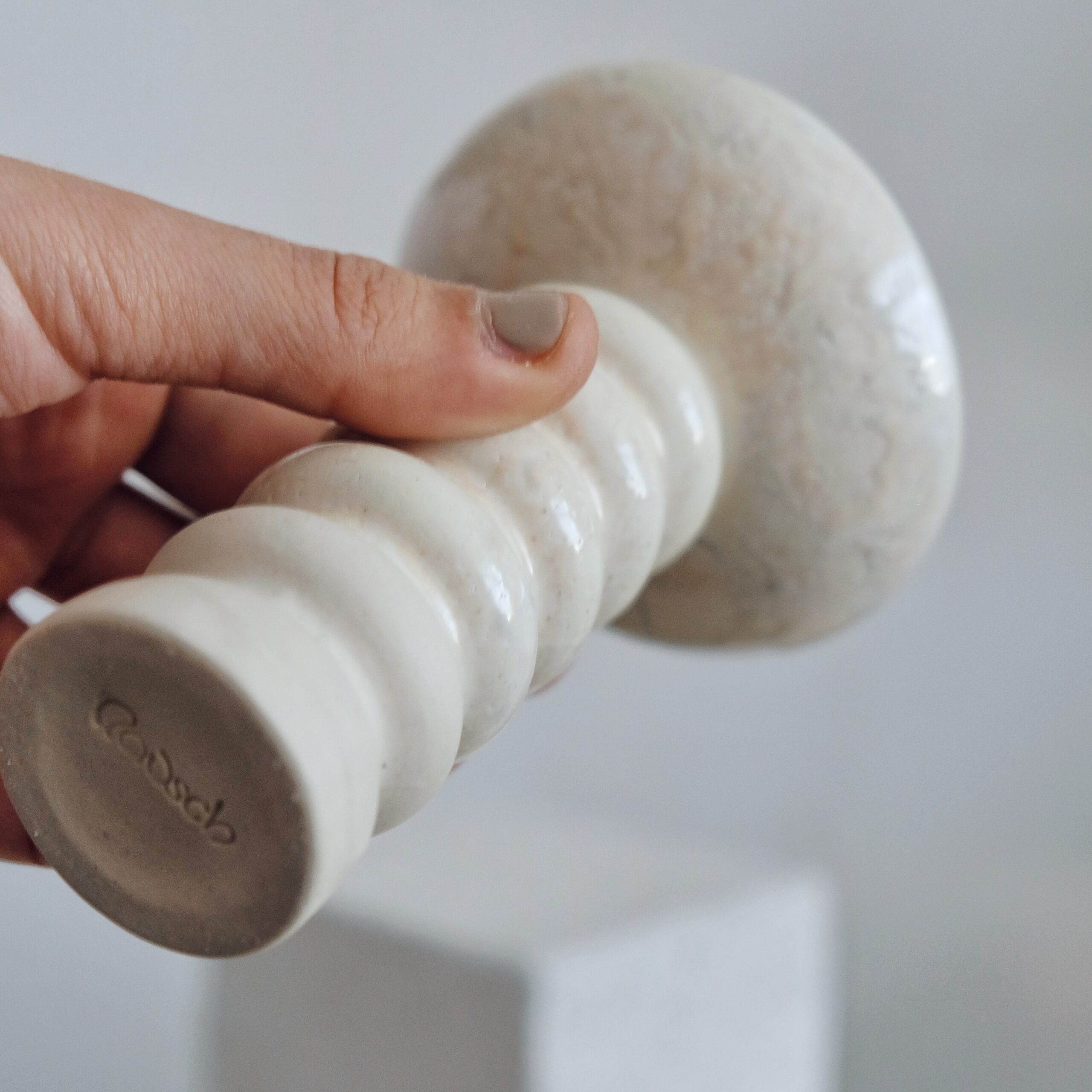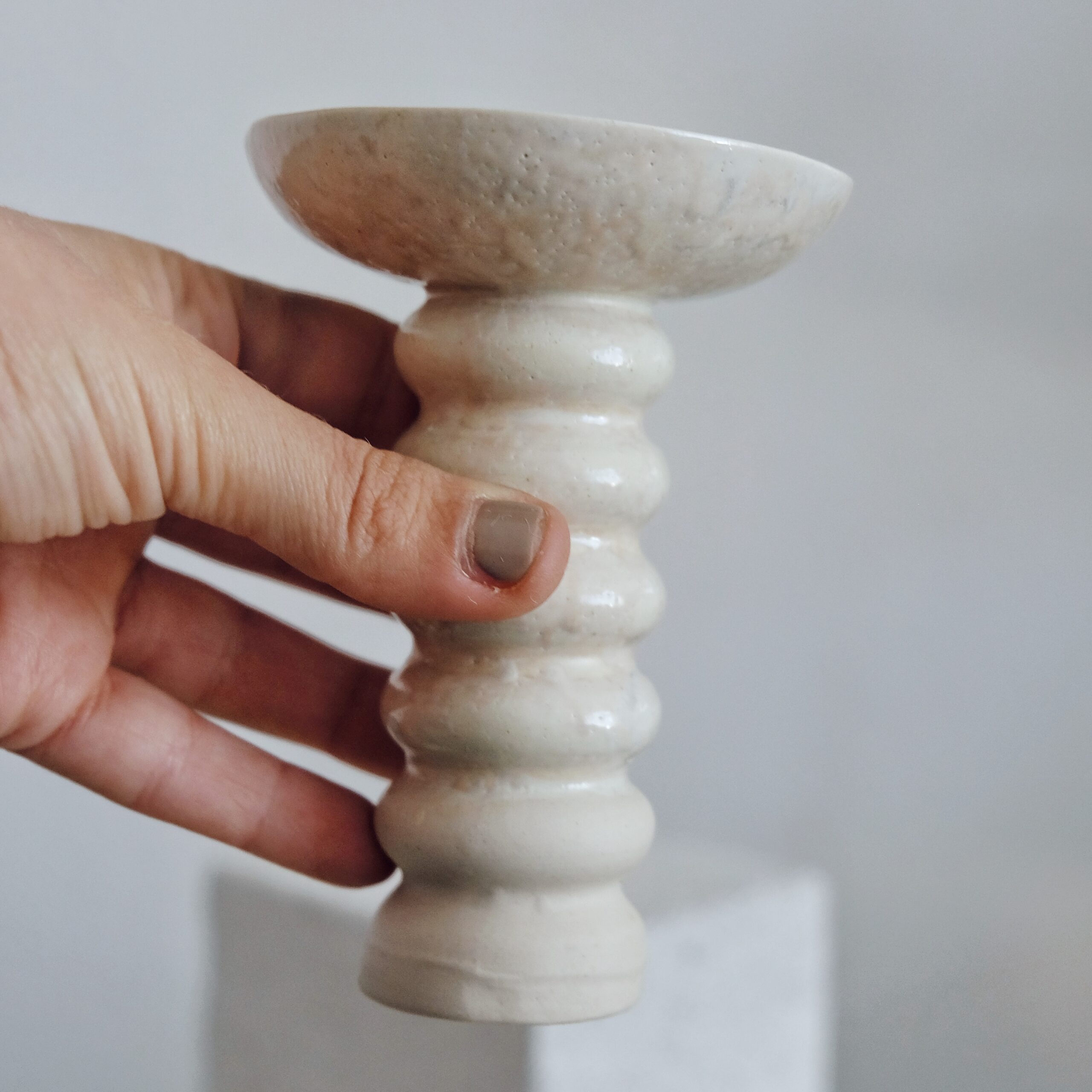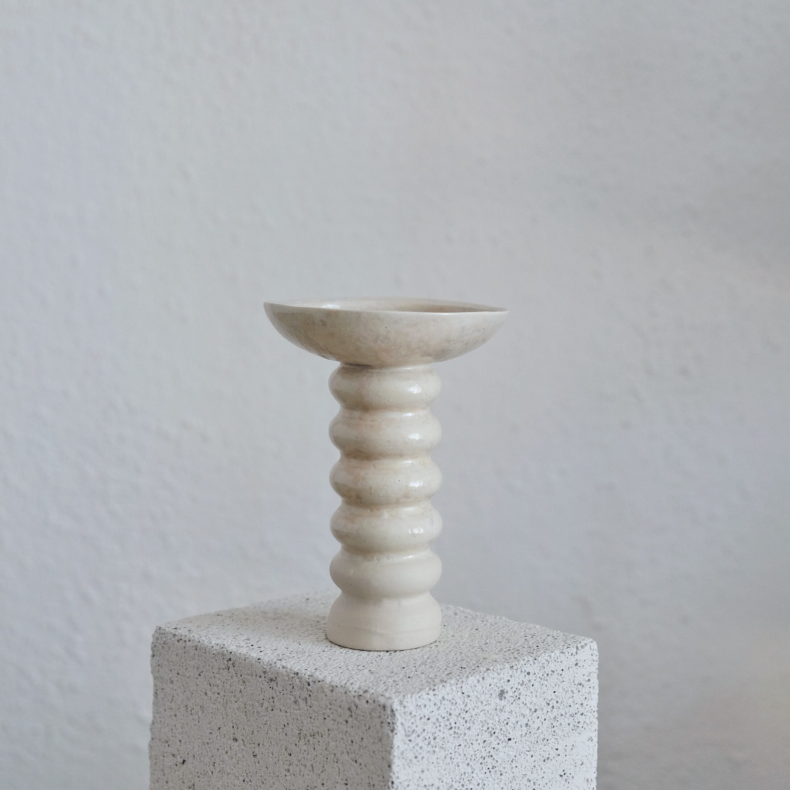 The Lilly features a sculptural stacked base that gives it both presence and playfulness. The ribbed, totem-like stem creates beautiful shadows and texture, while the wide, shallow bowl on top makes it perfect as a mini vase for a single bloom or a small arrangement, or simply as a sculptural decorative piece on its own.