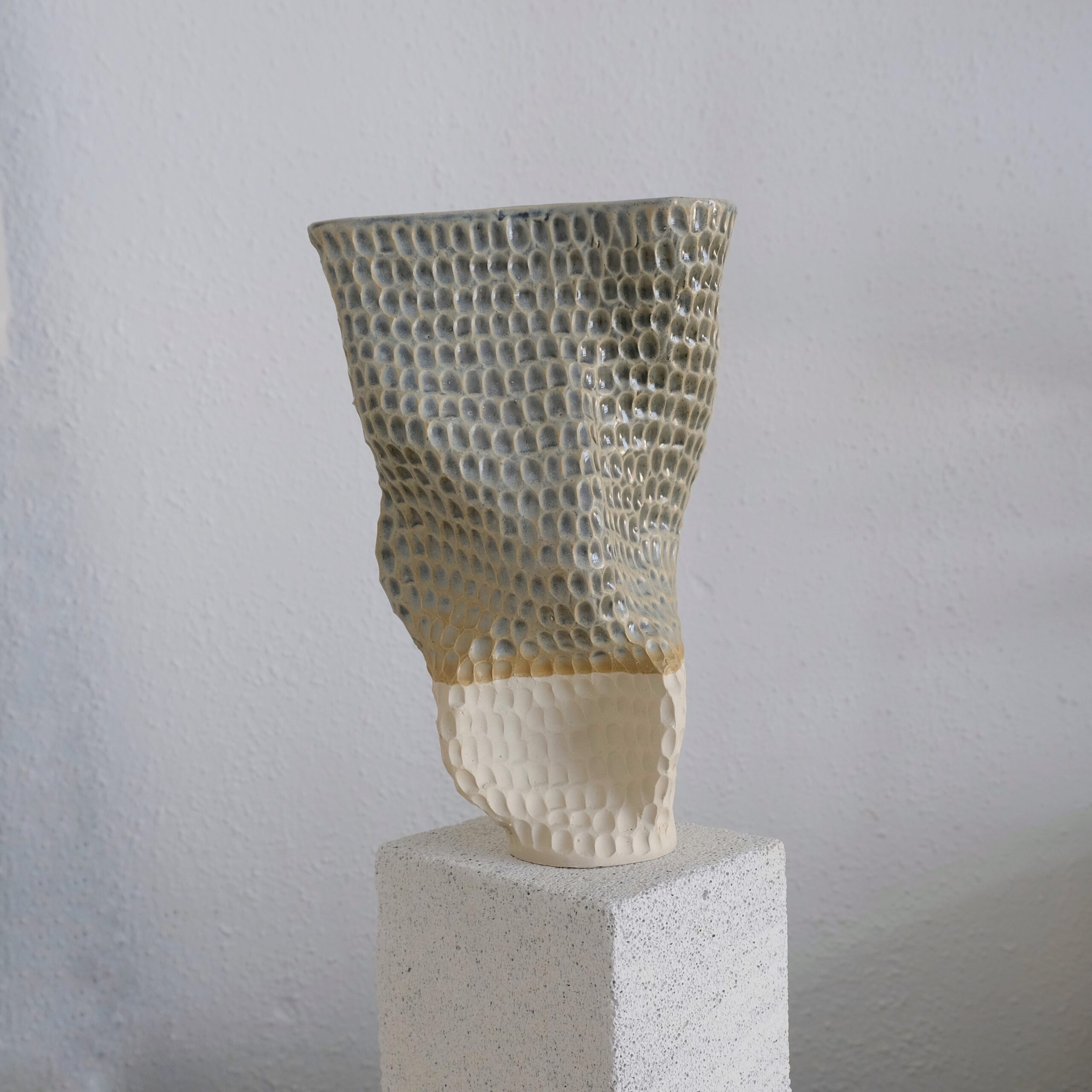 The process mirrors that of the lamp LUMA: the same shape, the same material logic, the same story held in clay. But this vase has an origin of its own. A 3D print came out far smaller than intended: wrong dimensions, realized too late. While waiting for the correct version to print, the small form was not set aside. A mold was made from it to practice the cuts, the seams, the decisions. What started as a workaround became a piece in its own right. From Lamp to Vase.
