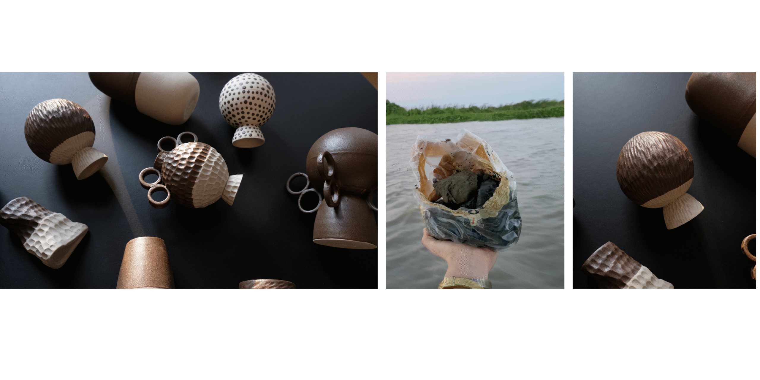 Back in the studio, I found out the wild clay ceramics process wasn’t going to be straightforward. The clay was too brittle to build with on its own. Every time I tried, it cracked and fell apart. So I had to think differently. I turned it into an engobe. Dipped my carved pieces into it instead of trying to construct anything from it directly. And that warm brown surface you see on the Magdalena Clay collection? That’s it. That’s the river.